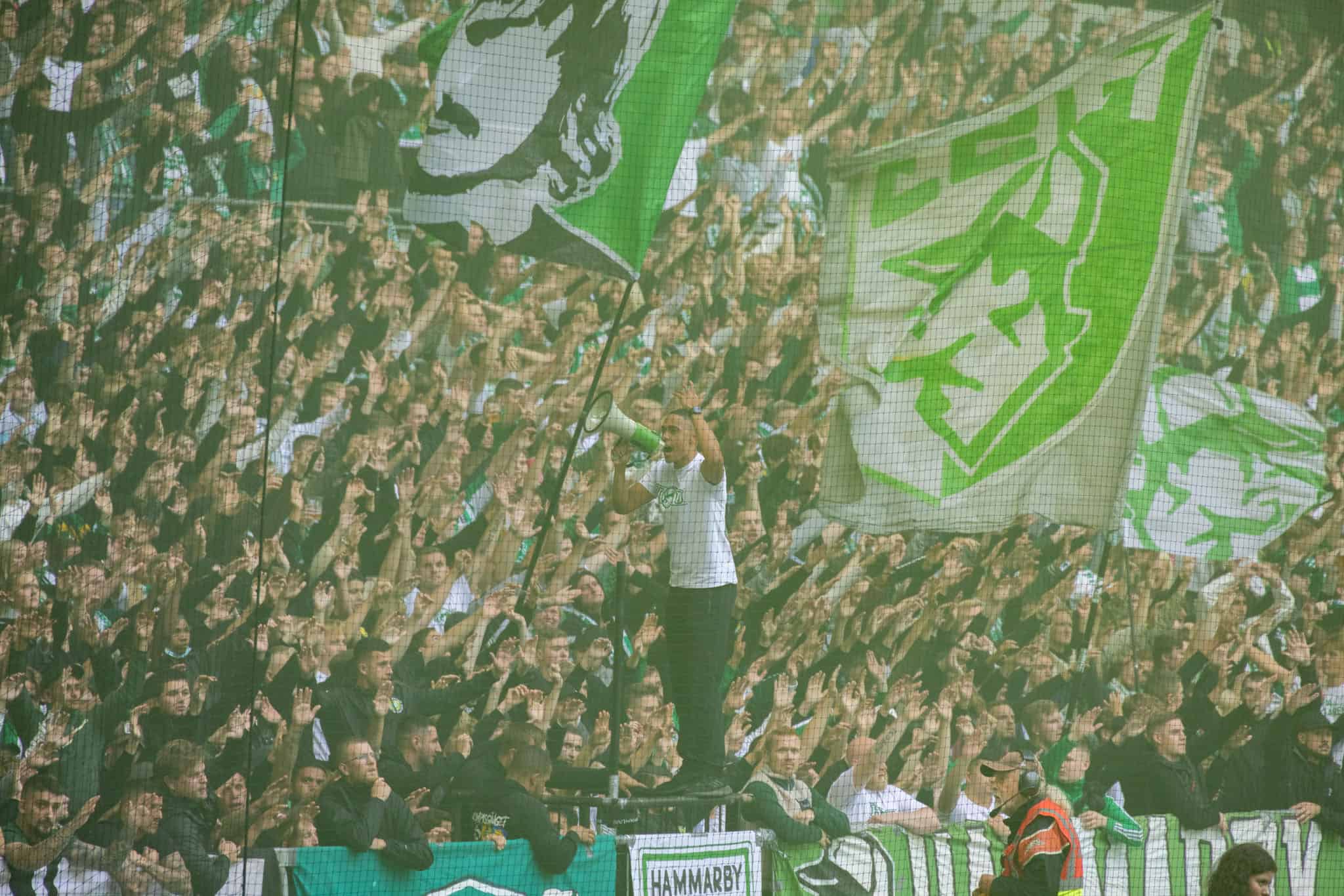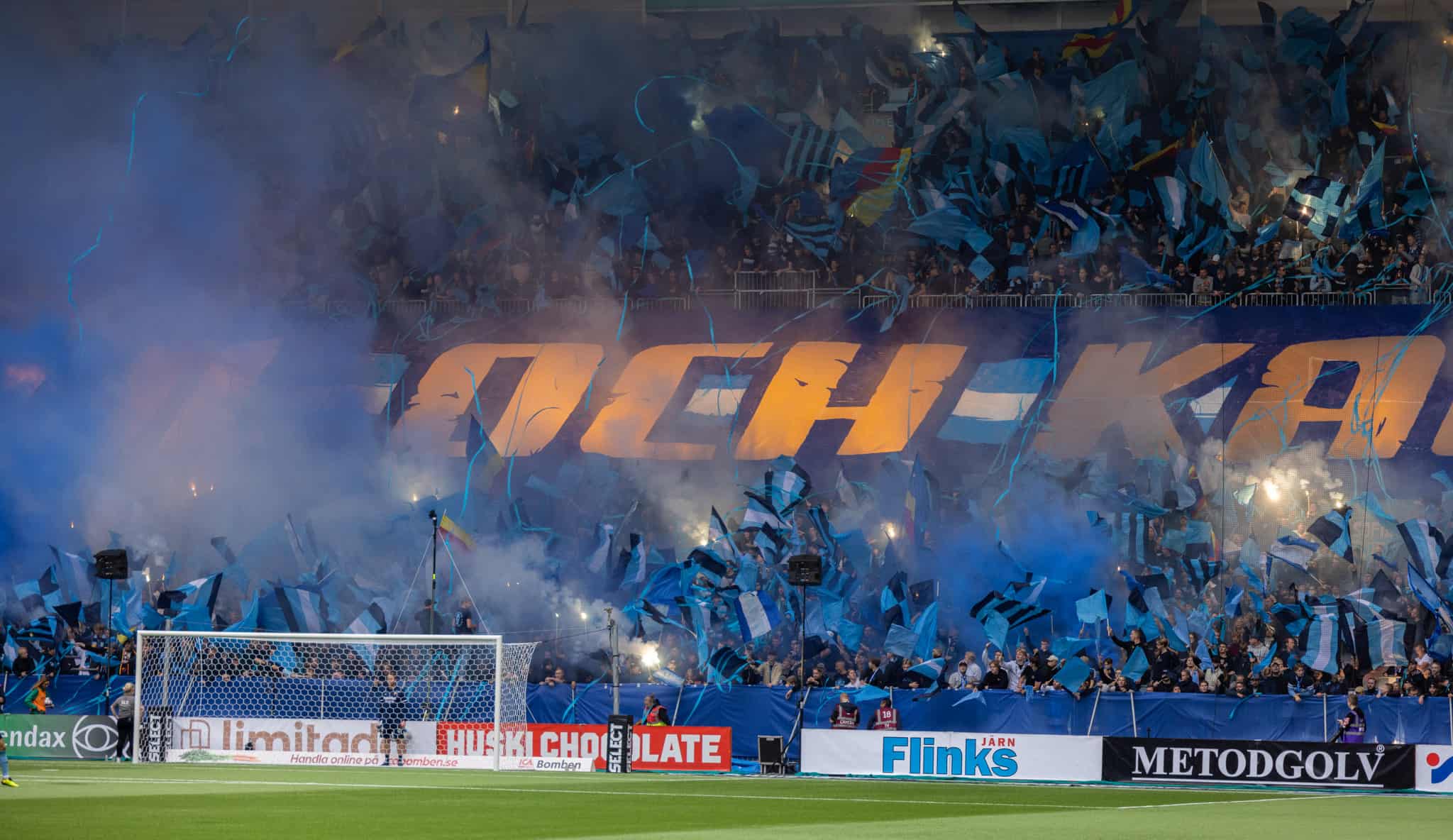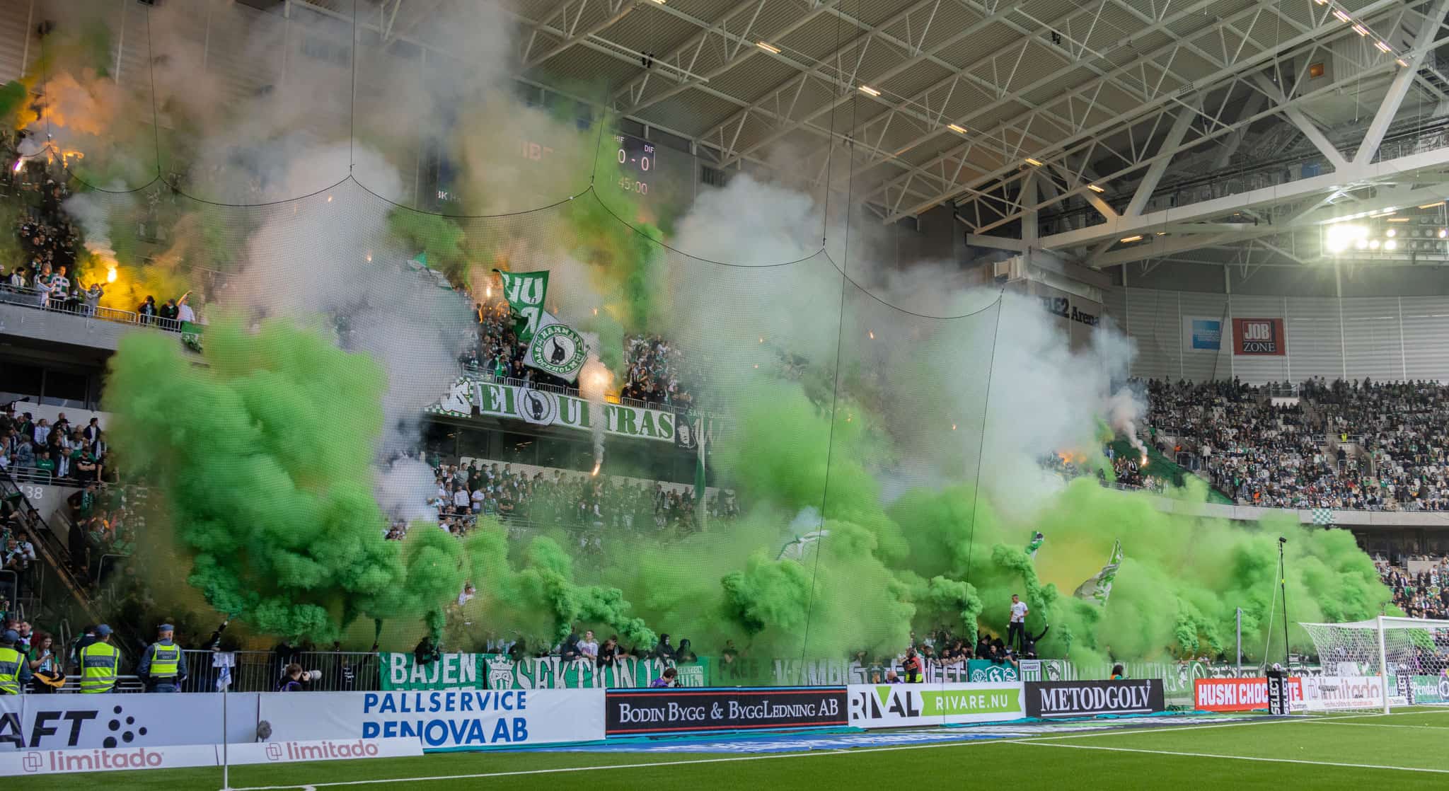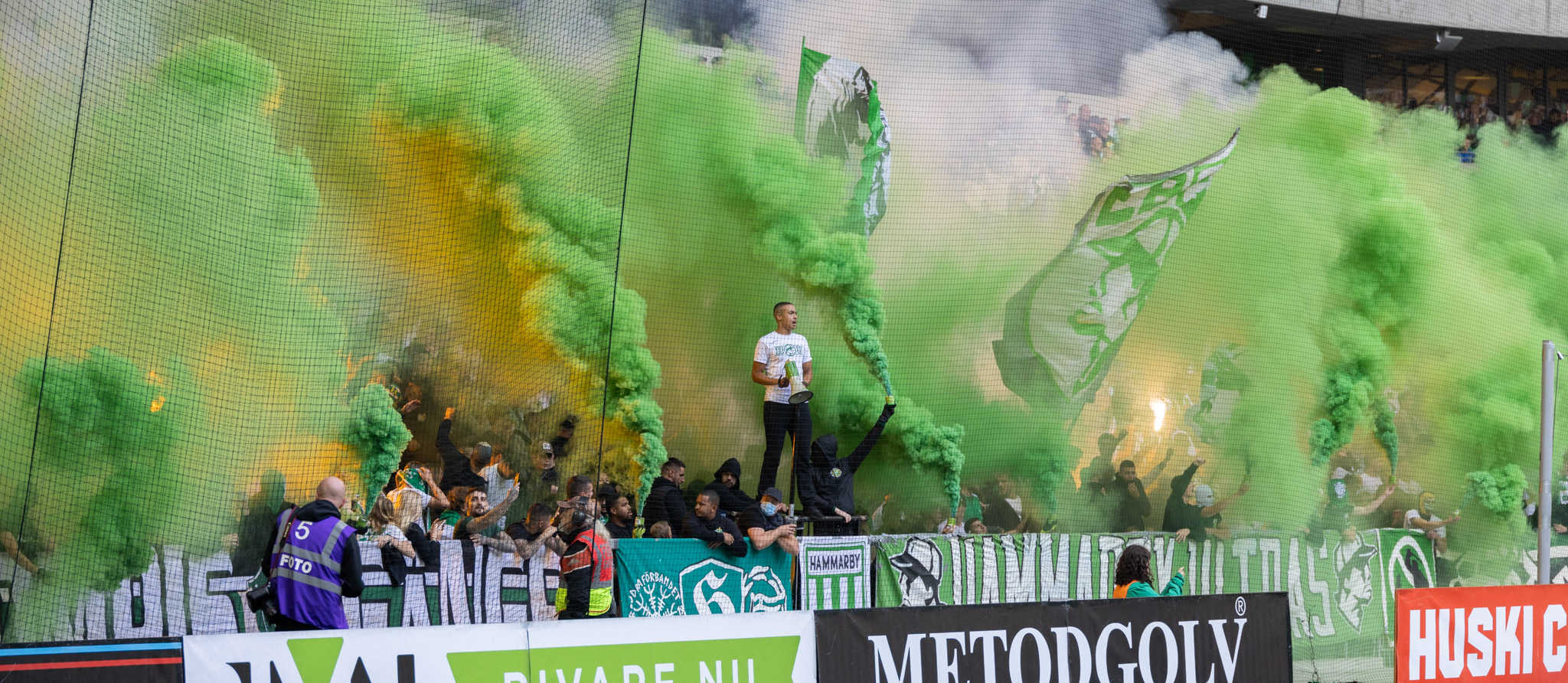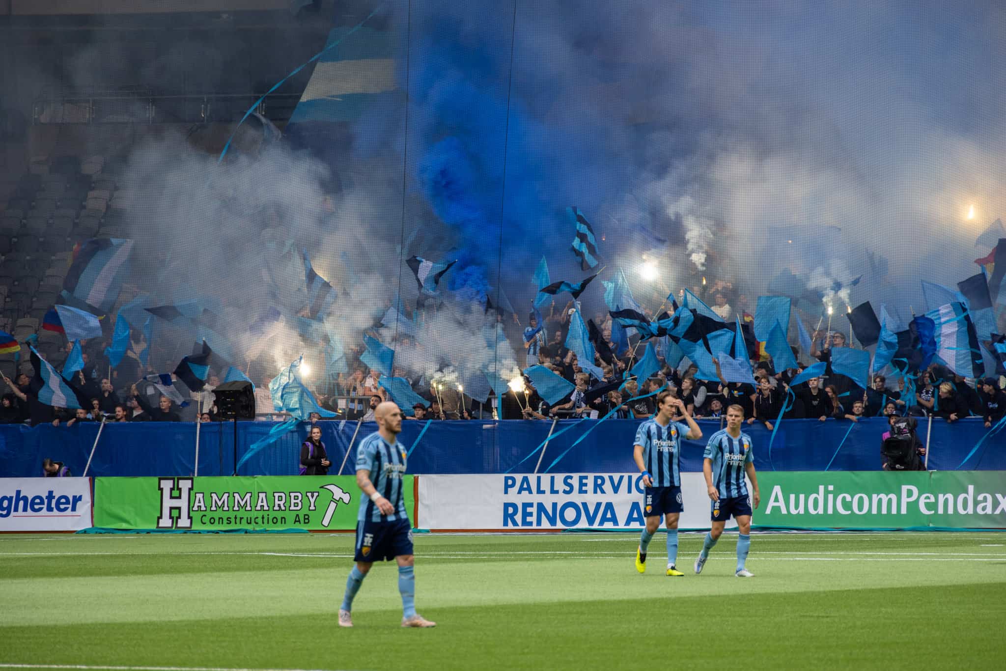 The second half is the same story. Everyone is on the edge of their seats. Hammarby’s fanatical supporters create a huge pyro show. The stadium fills with smoke which soon becomes a fog and play is halted.